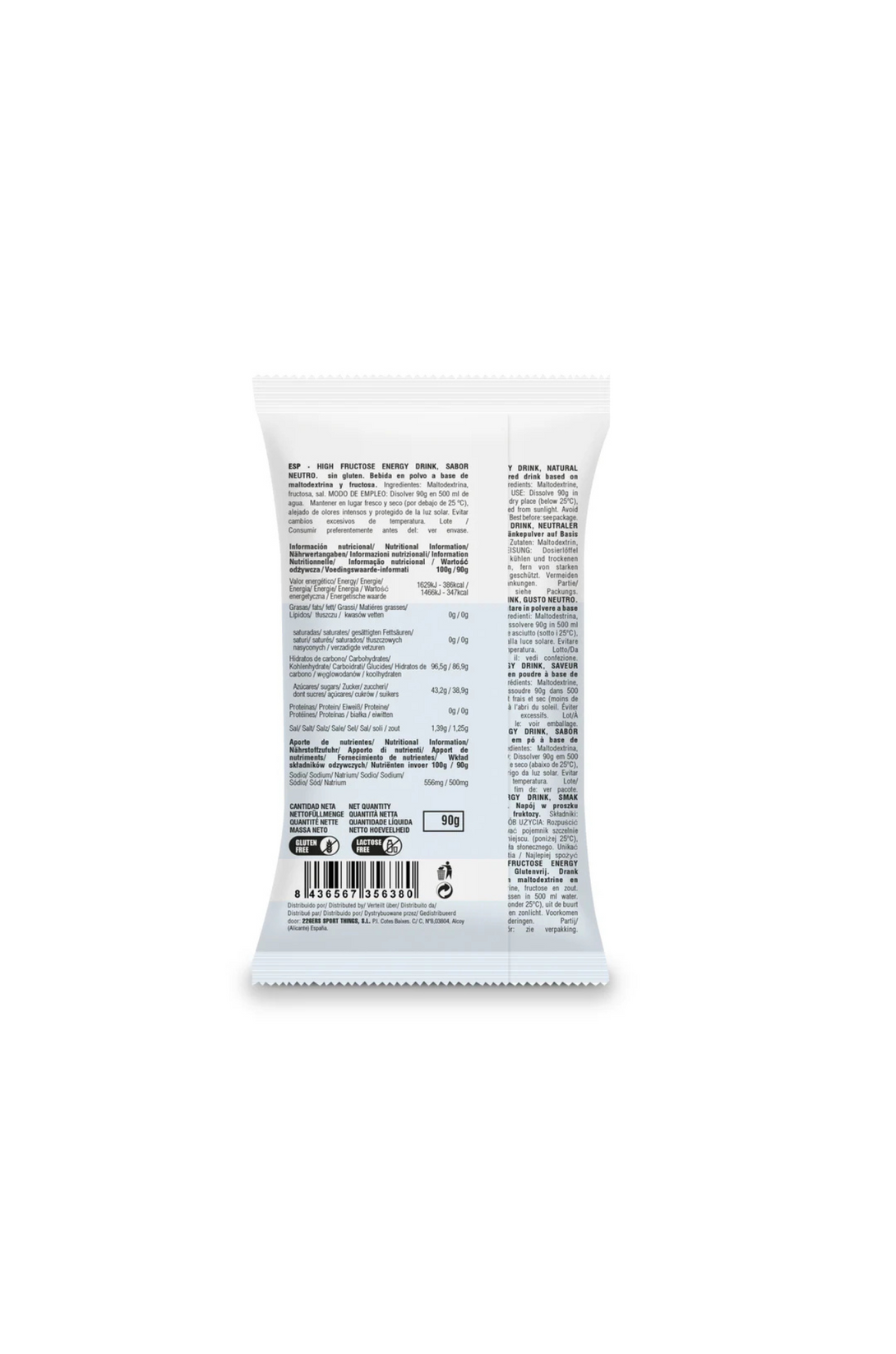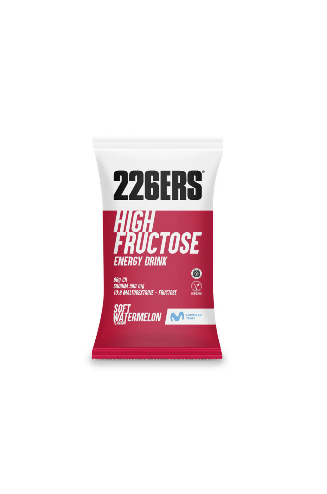HIGH FRUCTOSE ENERGY DRINK es una bebida formulada con maltodextrina y fructosa, en proporción 10:8, con un aporte de hidratos de carbono de 87g por toma y 347 Kcal. Además de 500 mg de sodio. Es apto para veganos, sin gluten y está disponible en tres sabores.